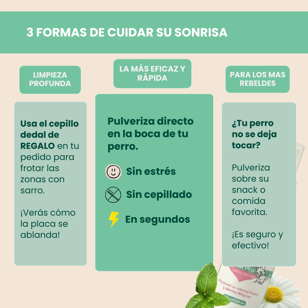 Es el único spray que mi perro acepta sin esconderse. No sé si es por el olor o el sabor, pero se porta súper bien. He notado una diferencia grande en la limpieza de sus muelas traseras.