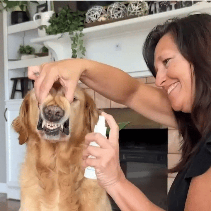 Aplicación sencilla: Pulveriza directamente sobre los dientes y encías de cada lado de la boca. No es necesario que el perro se deje manipular mucho, el spray alcanza las zonas difíciles por sí solo.